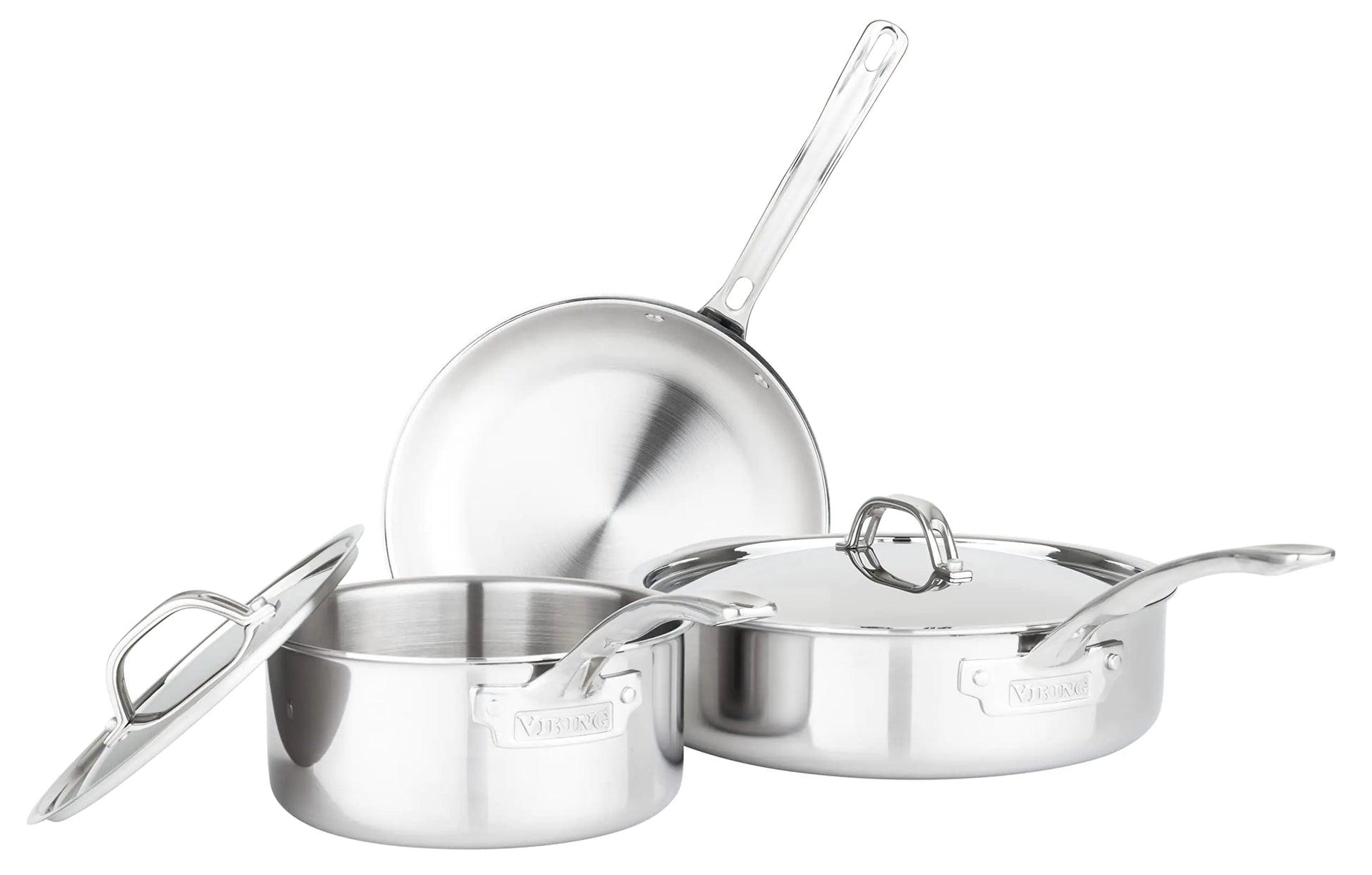 The Viking 5-Piece 3-Ply Clad Stainless Steel Cookware Set features three layers of stainless steel and aluminum to distribute heat evenly throughout the pan sides included. The set features metal lids that helping to reduce the chance of boil-overs. The interior of the saucepans and stock pots are marked with easy-to-use measurement markings so you know how much rice or liquid to add. The cookware features the signature Viking solid cast stainless steel handles that are riveted on with stainless steel rivets for a lifetime of use. The stainless steel pans are oven grill and broiler safe to 600°F without the lid. The lids are oven safe to 350°F making it easy to finish a dish in the oven or even bake an entire casserole in the pan and take it right to the table for serving. All of the lids and cookware are dishwasher safe but we always recommend hand-washing to help maintain the mirror polished finish and extend the life of the cookware.